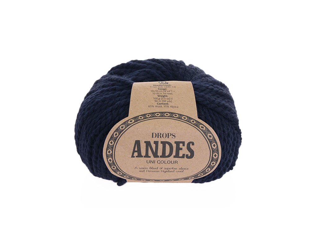 Příze DROPS Andes je silná dvouvláknová příze s výrazným zákrutem, složená z již tradiční kombinace 65% vlny a 35% alpaky. Takové složení jí poskytuje alpakově hedvábný vzhled, zatímco vlna dodává vyšší tvarovou stálost. Vlákna této příze nejsou nijak upravovována - před barvením neprochází žádnou formou chemického ošetření, pouze běžným praním. Tak jsou zvýrazněny přirozené vlastnosti vláken a navíc jim takový postup dodává lepší tvar i strukturu.